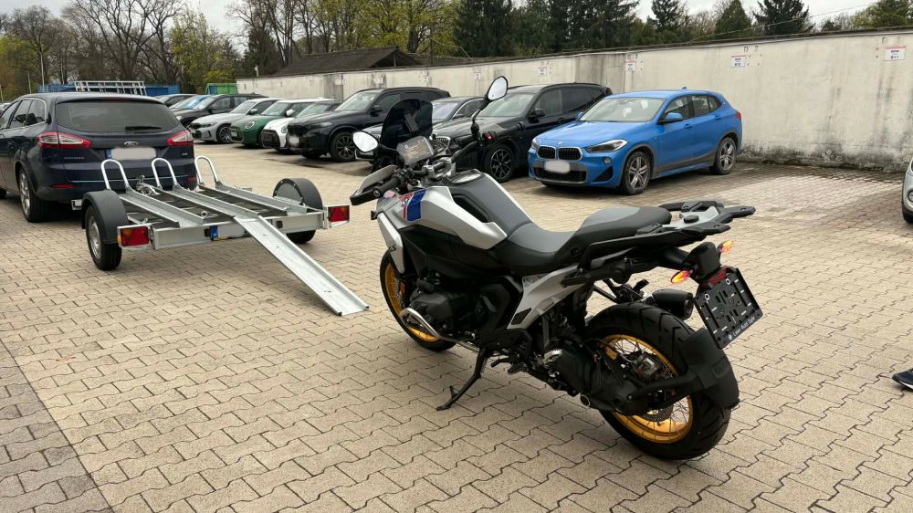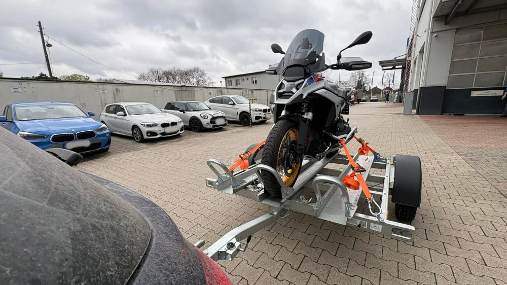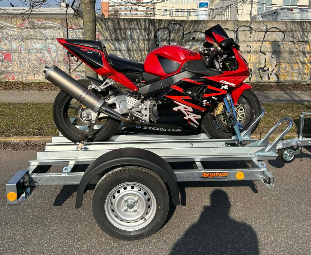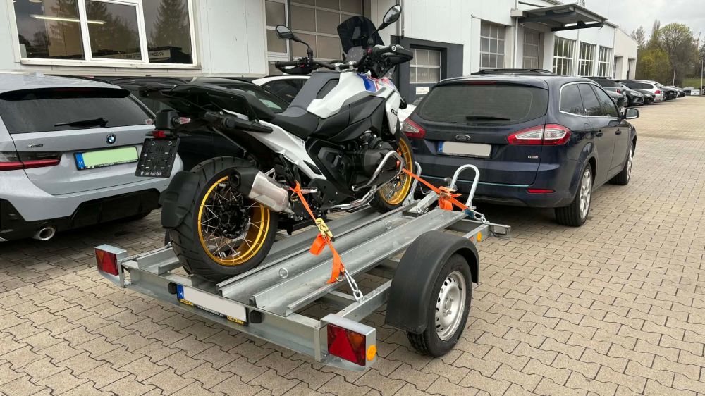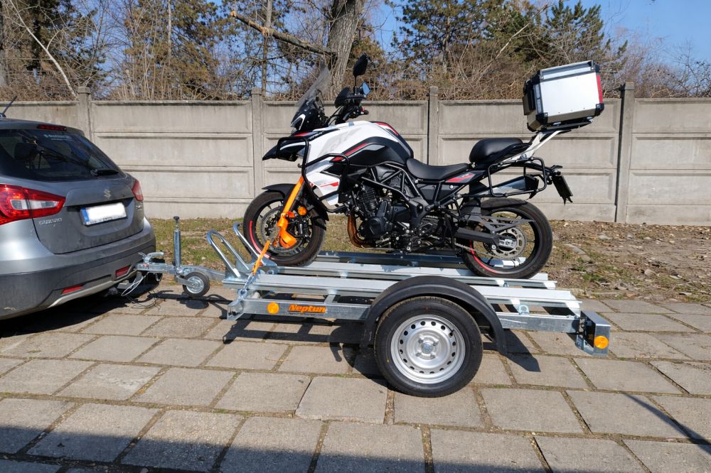 Ez a bérelhető utánfutó speciális rögzítési pontokkal és stabil vázzal készült, hogy a motor szállítás közben ne mozduljon el.